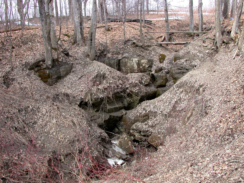 Levys Cave is a small stream insurgence cave which takes large amounts of water during the spring. The cave is about 200 feet long and has a twelve foot drop inside the cave that requires a rope or cable ladder.